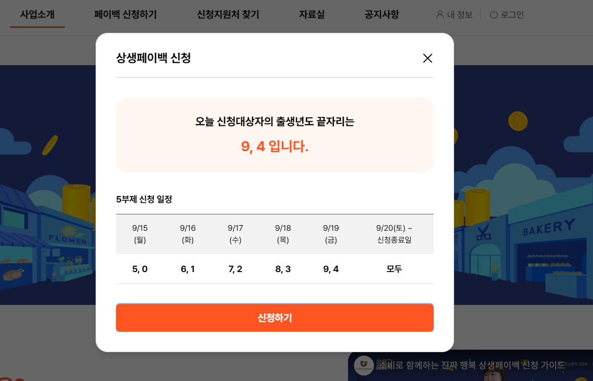 오늘은(9/19) 출생 연도 끝자리 9,4인 분들이 신청하실 수 있으세요.