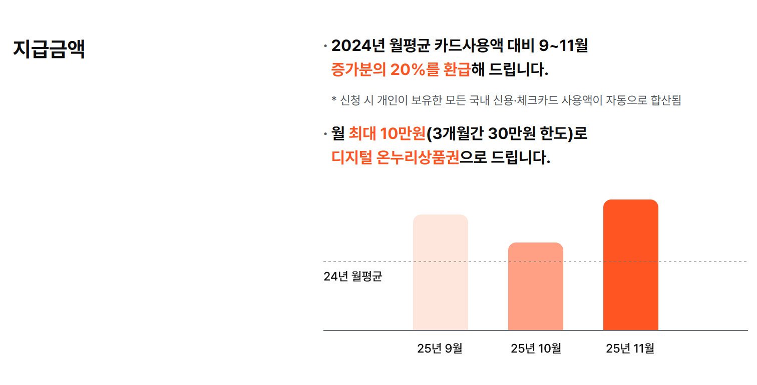 상생페이백은 2024년 월 평균 카드사용액 대비 2025년 9~11월 증가분에 대해서 20%를 환급해 주는 제도입니다!