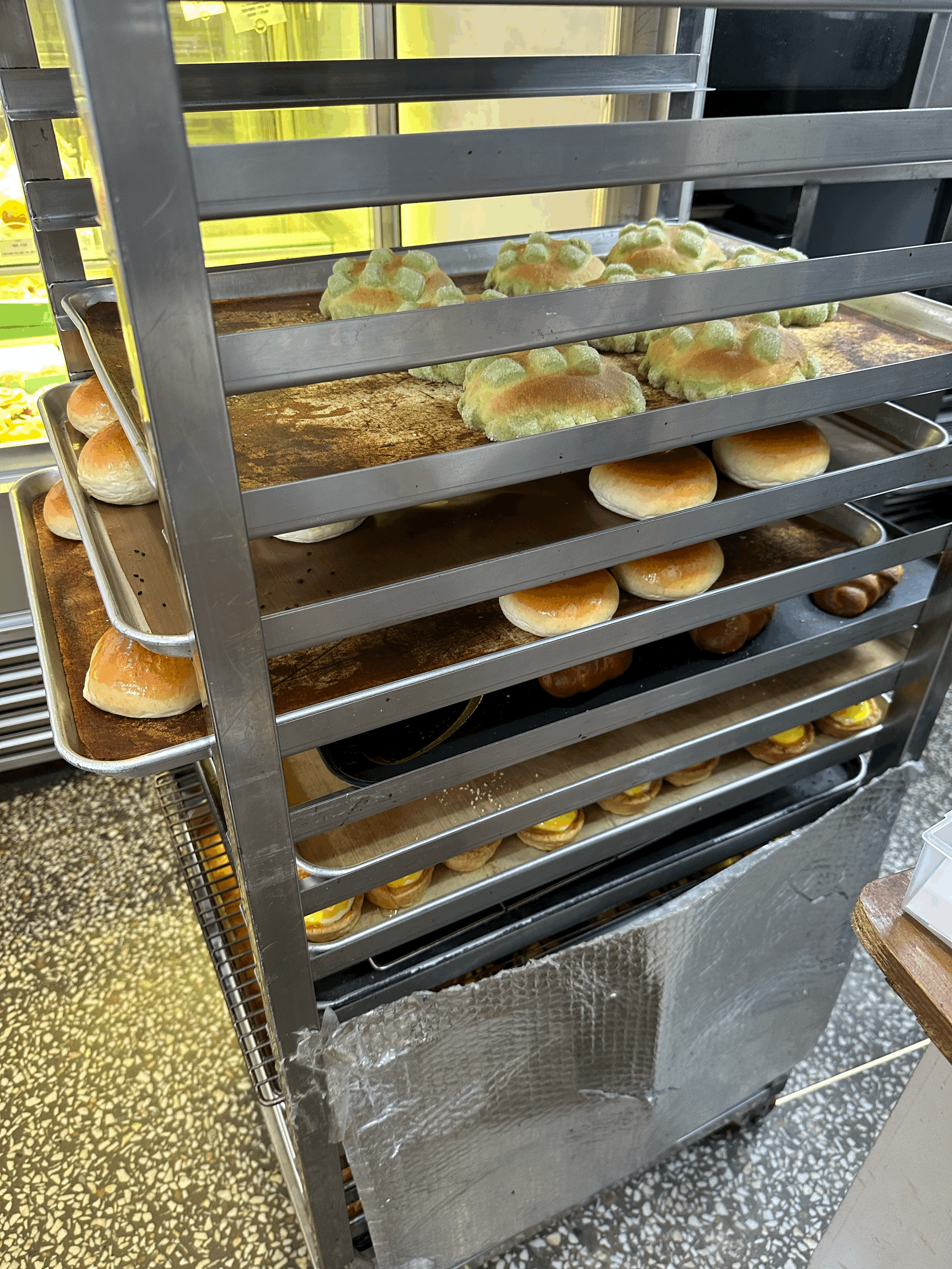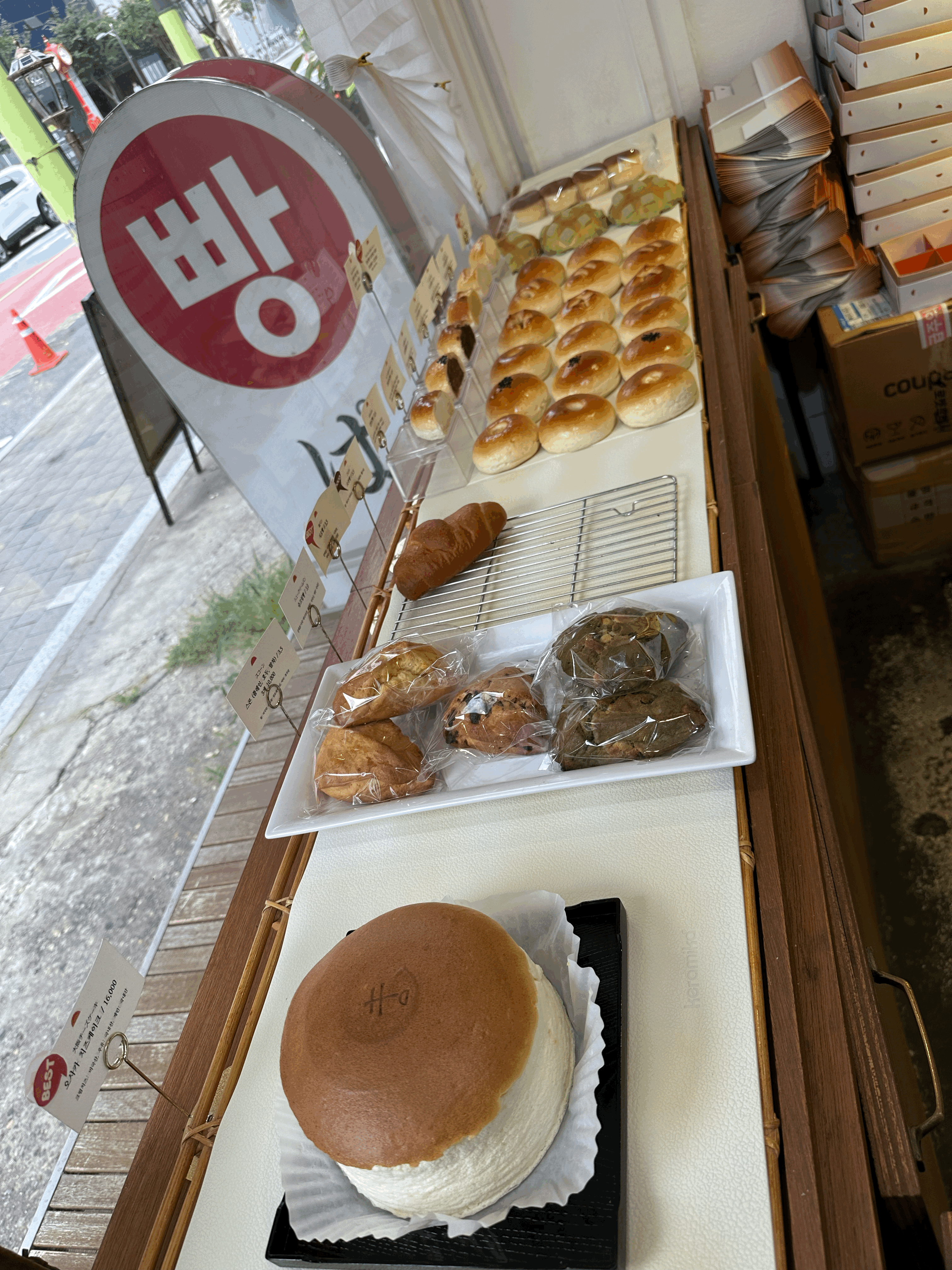 빵 종류는 오사카 치즈케이크, 스콘, 소금빵, 앙금빵, 메론빵, 초코소라빵, 타르트 종류, 쿠키 이렇게 있었어요!