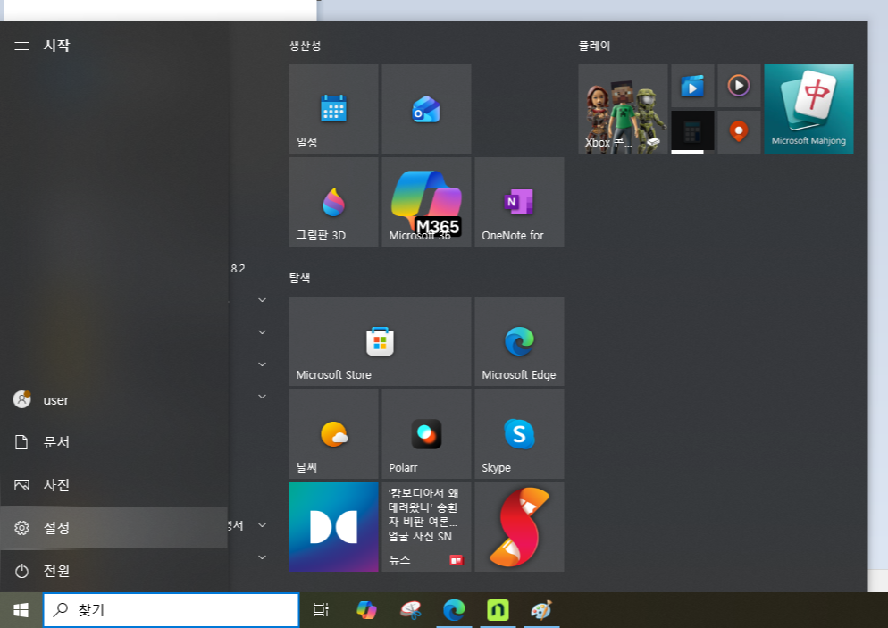 1. 윈도우 > 설정을 클릭해 줍니다.