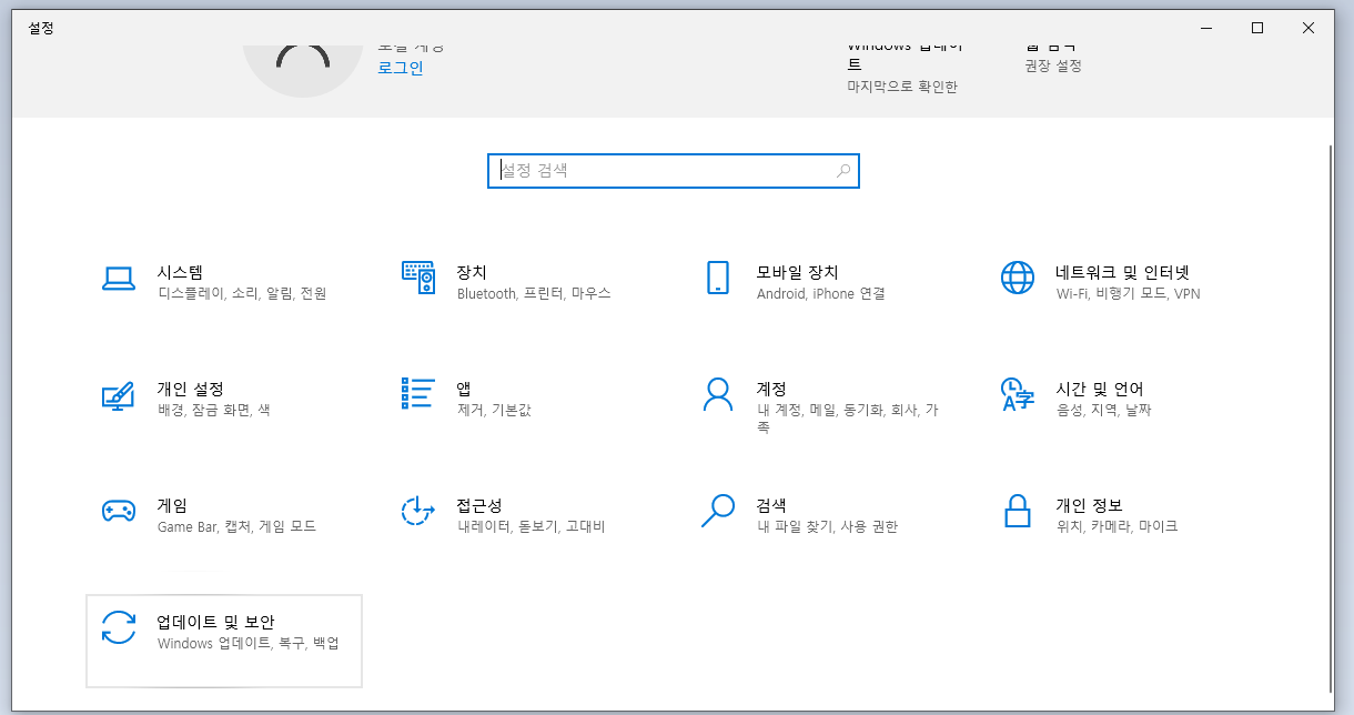 2. 업데이트 및 보안을 클릭합니다.