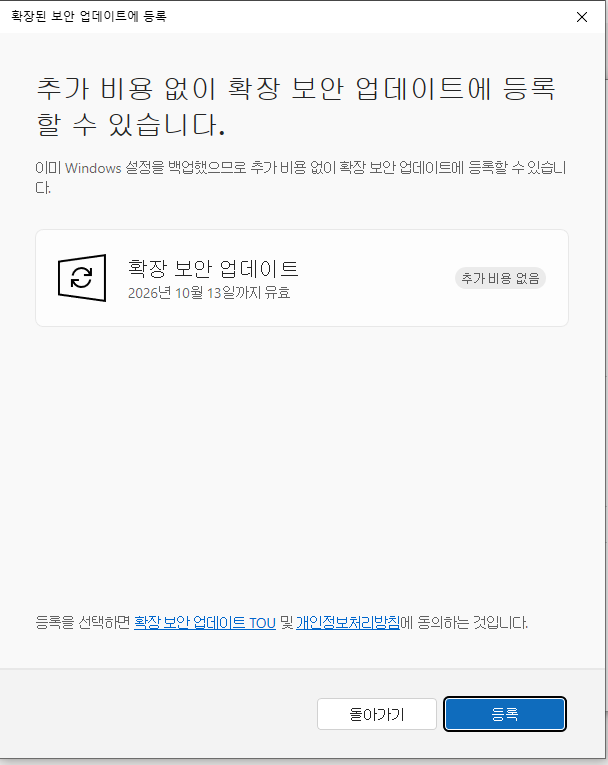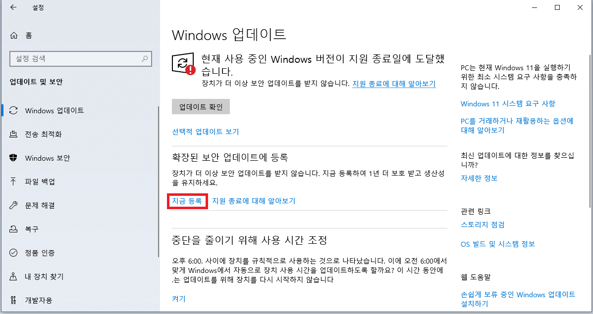 지원이 종료된 후에도 중요 보안 업데이트를 받기 위해서는 확장 보안 업데이트에 등록을 해야 합니다.
