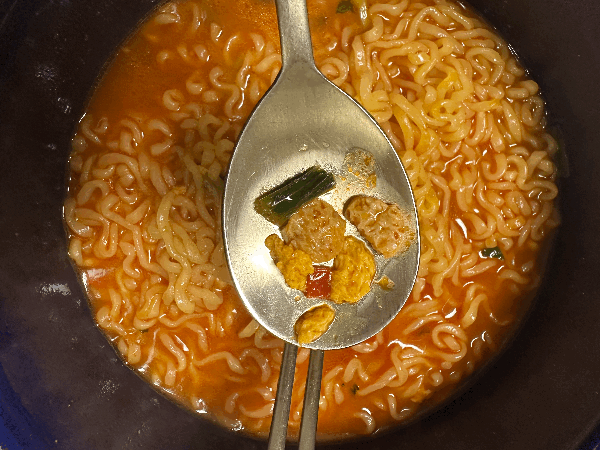 기존 신라면과 다르게 건더기에 계란 후레이크가 들어있고, 버섯 후레이크는 없었어요.