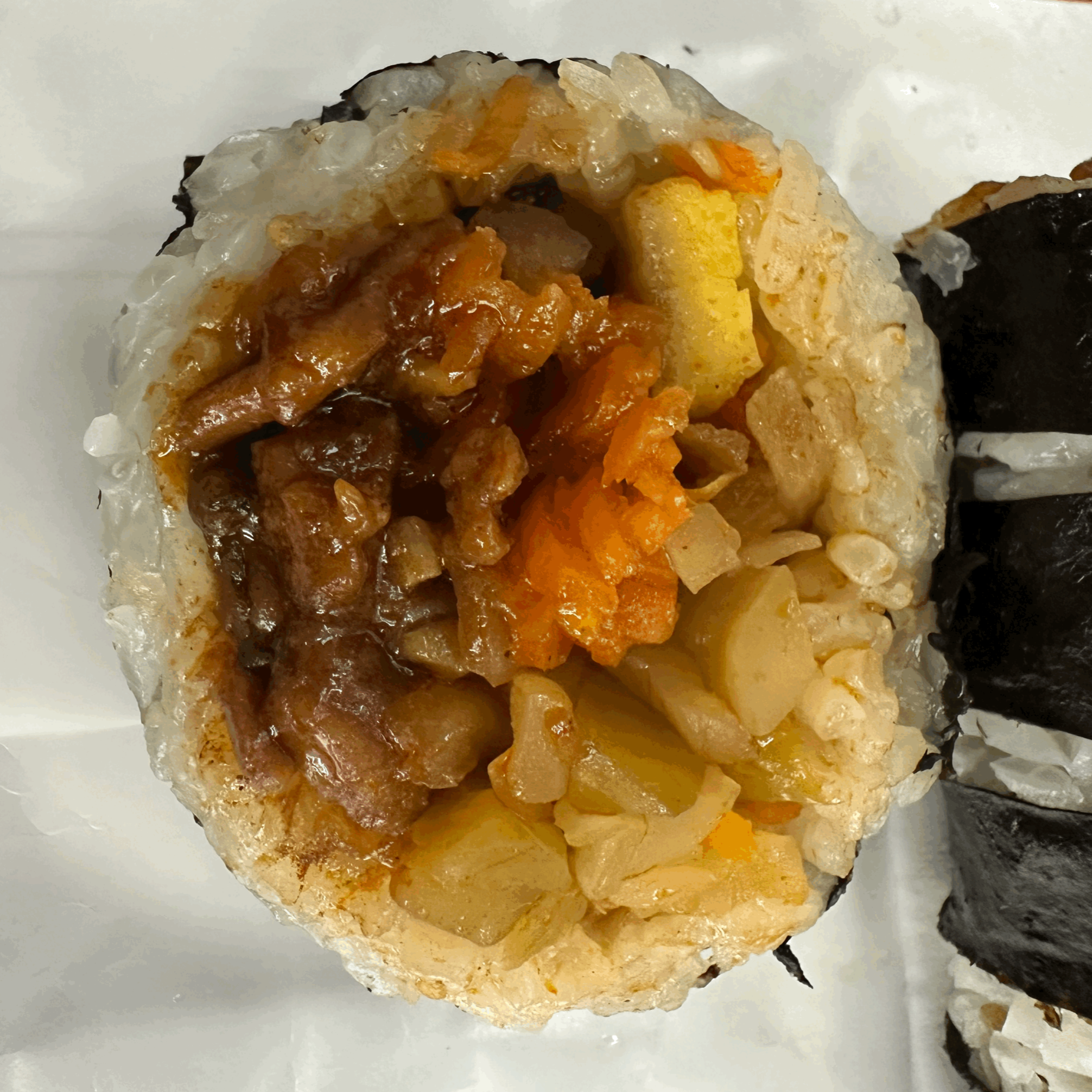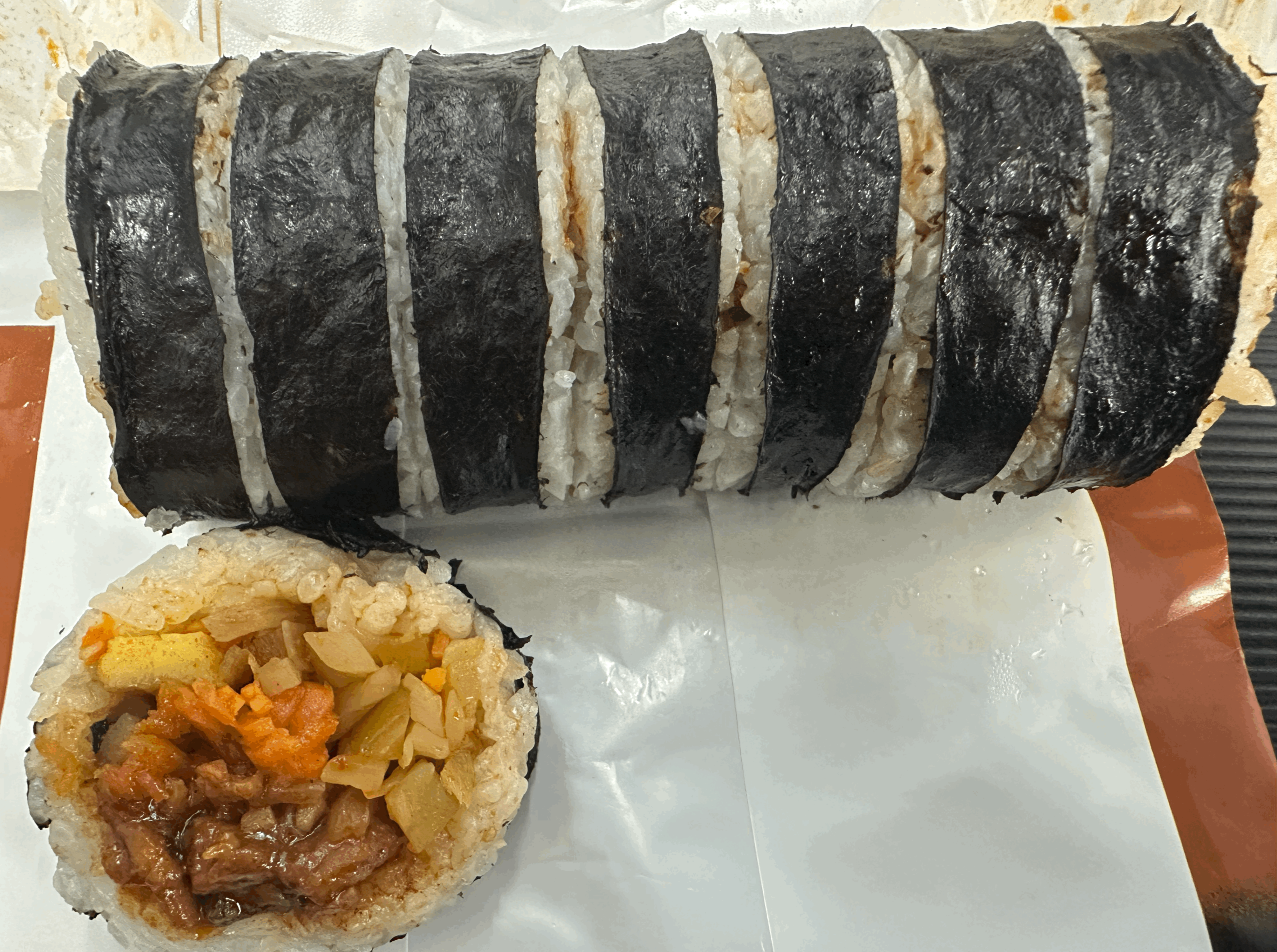 김밥 단면을 자세히 살펴보면 고기가 상당히 많이 들어가 있는 편이고, 당근도 꽤 많이 들어있어요!