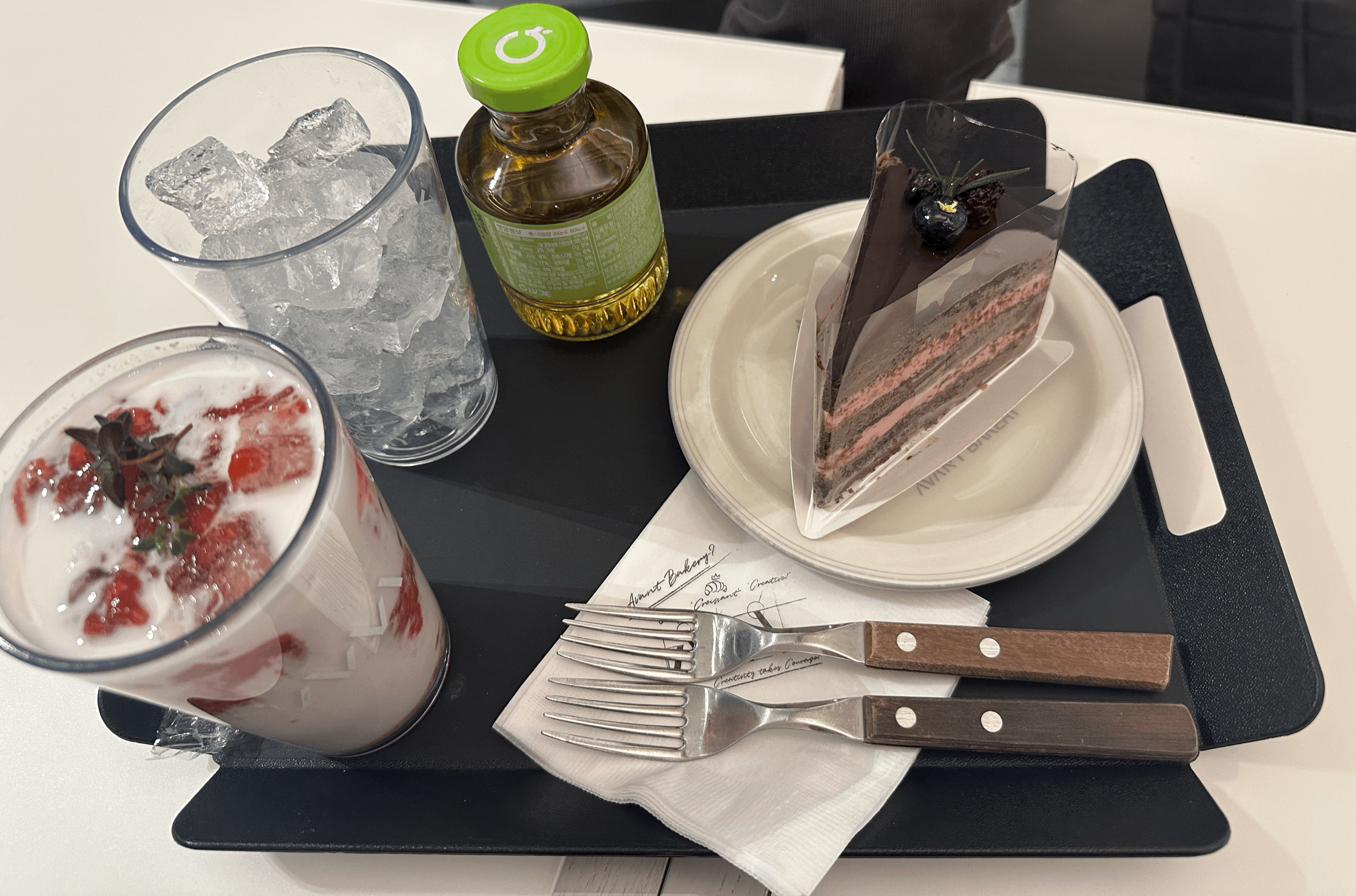 저희는 친구 추천으로 딸기라떼, 루즈벨르 쇼콜라 케이크, 사과식초음료를 주문했습니다.