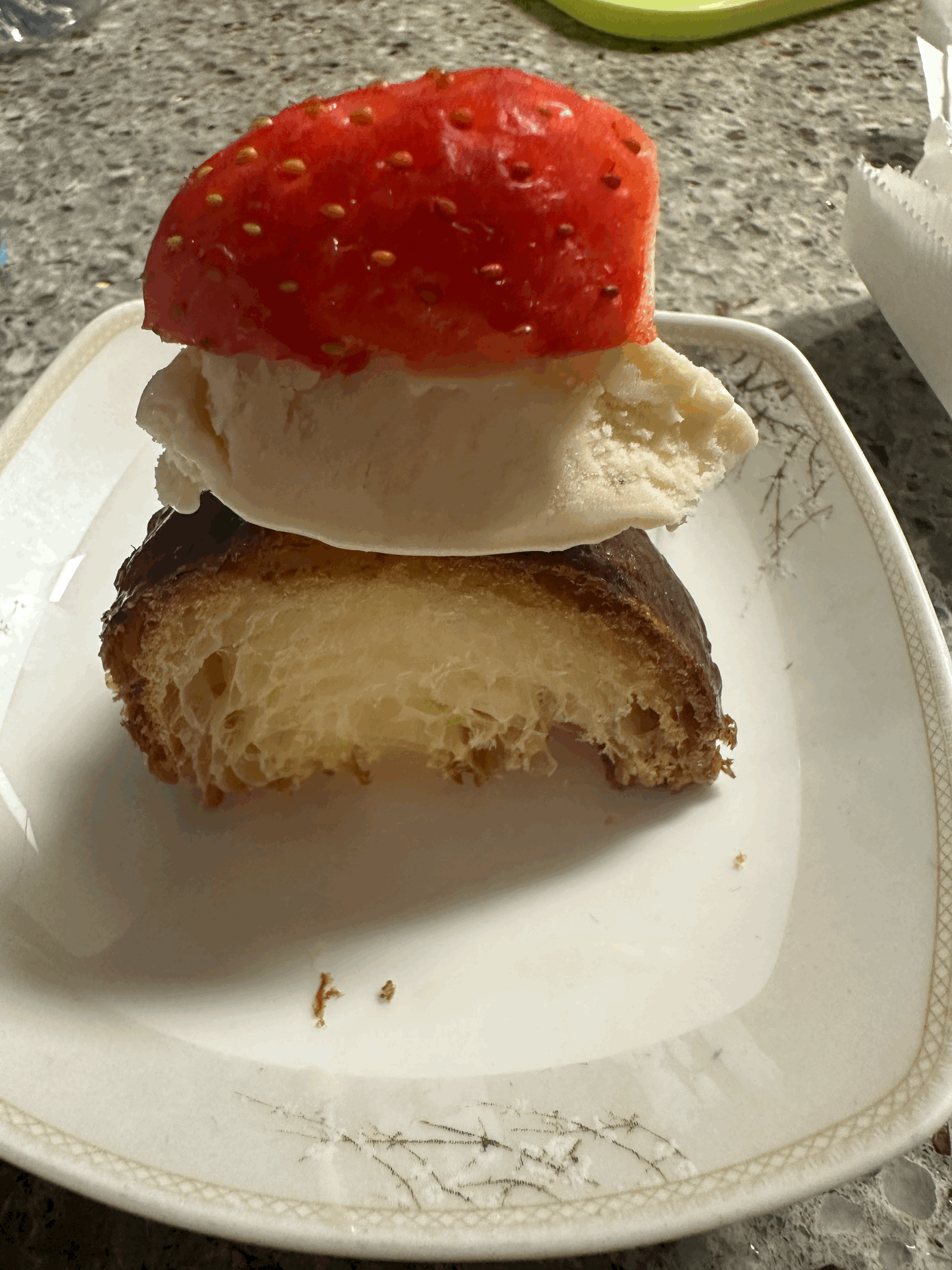 그래서 빵 위에 아이스크림 얹고, 상큼한 맛을 더해주기 위해서 집에 있는 딸기도 얹어줬어요.